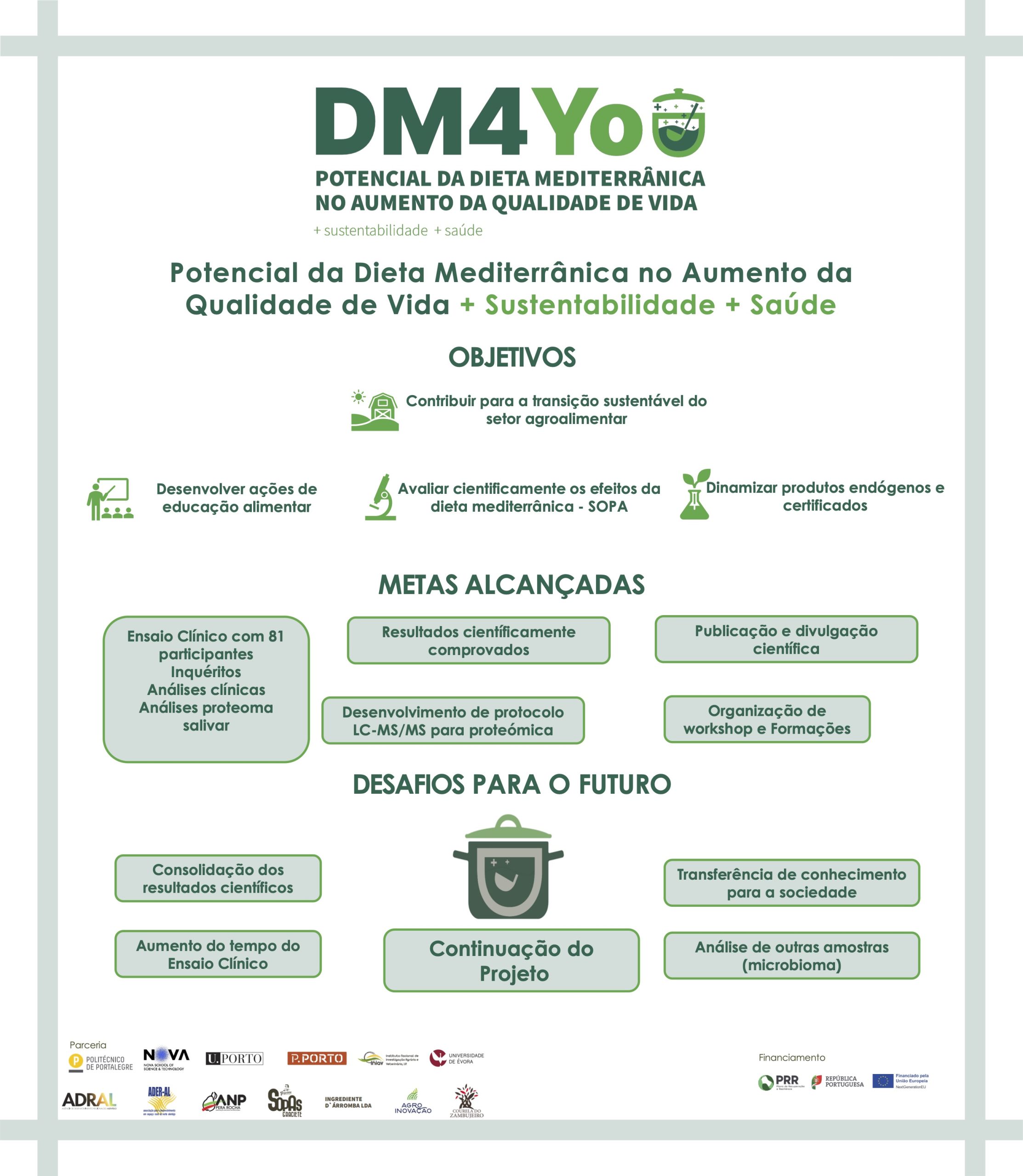 DM4You é a sigla de um projeto liderado pelo Politécnico de Portalegre e que pretende demonstrar, dinamizar e divulgar os benefícios da adesão à Dieta Mediterrânica para a saúde, para o ambiente e para a sociedade em geral. Pretende-se avaliar o efeito do consumo de sopa e fruta, na saúde e na longevidade num ensaio pioneiro em Portugal.
